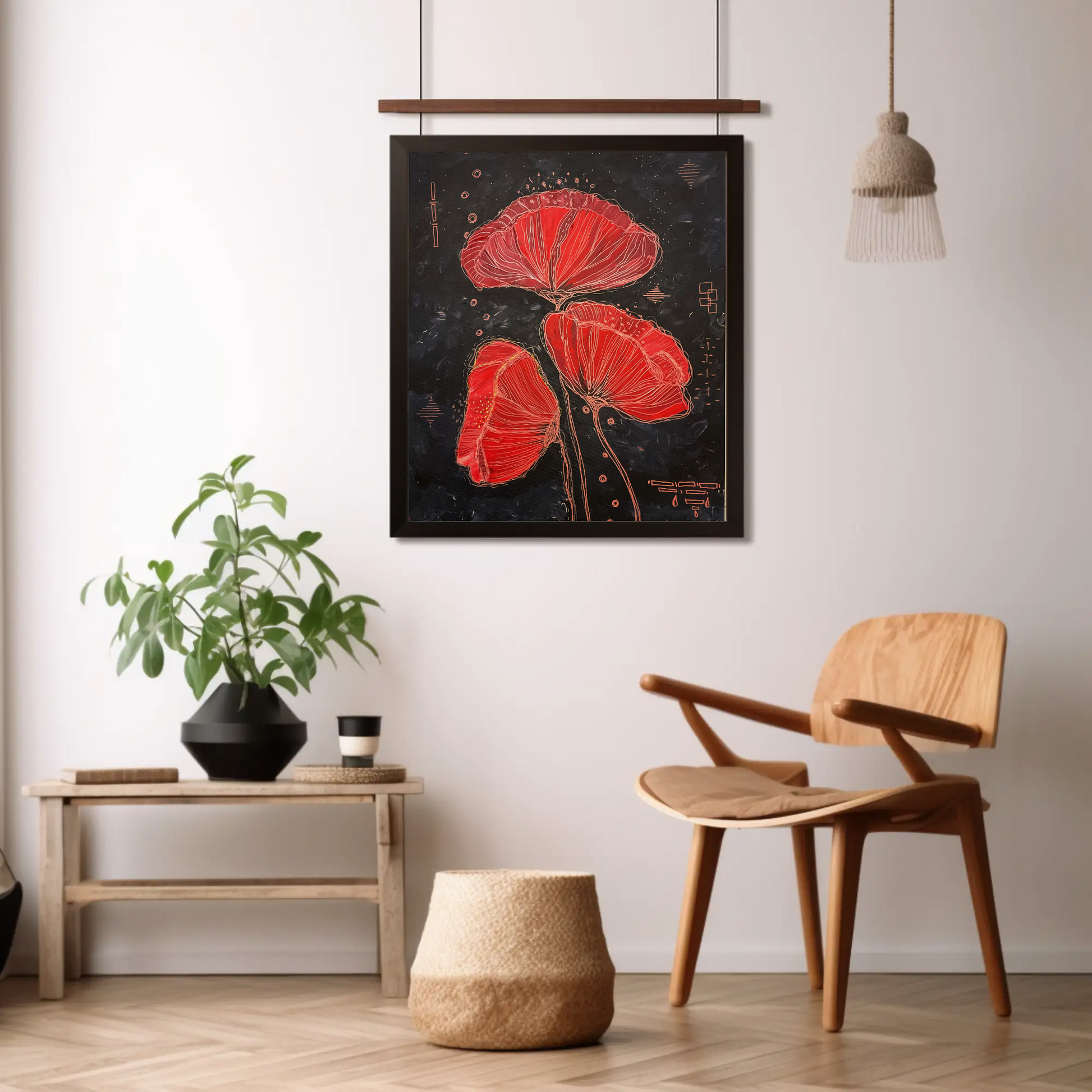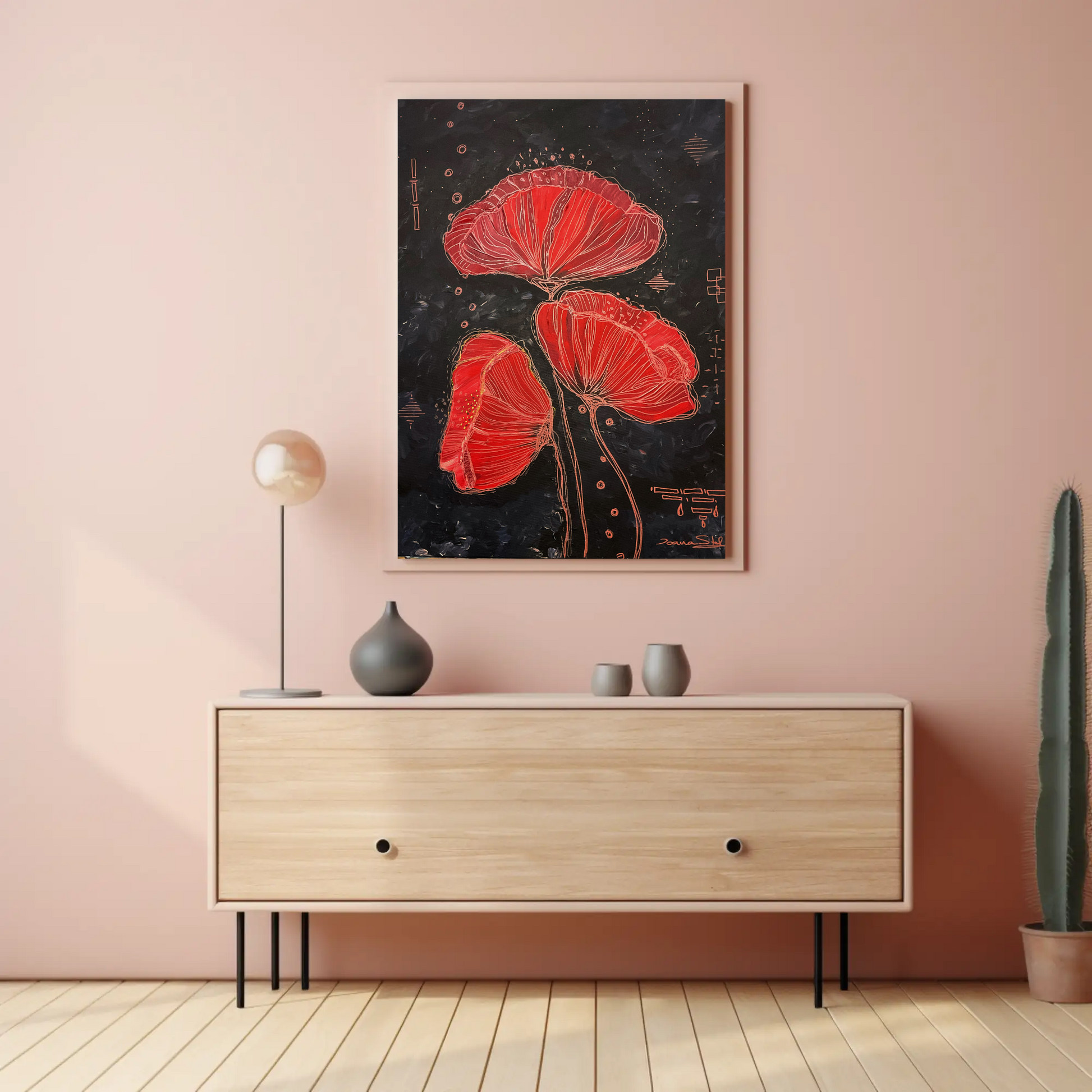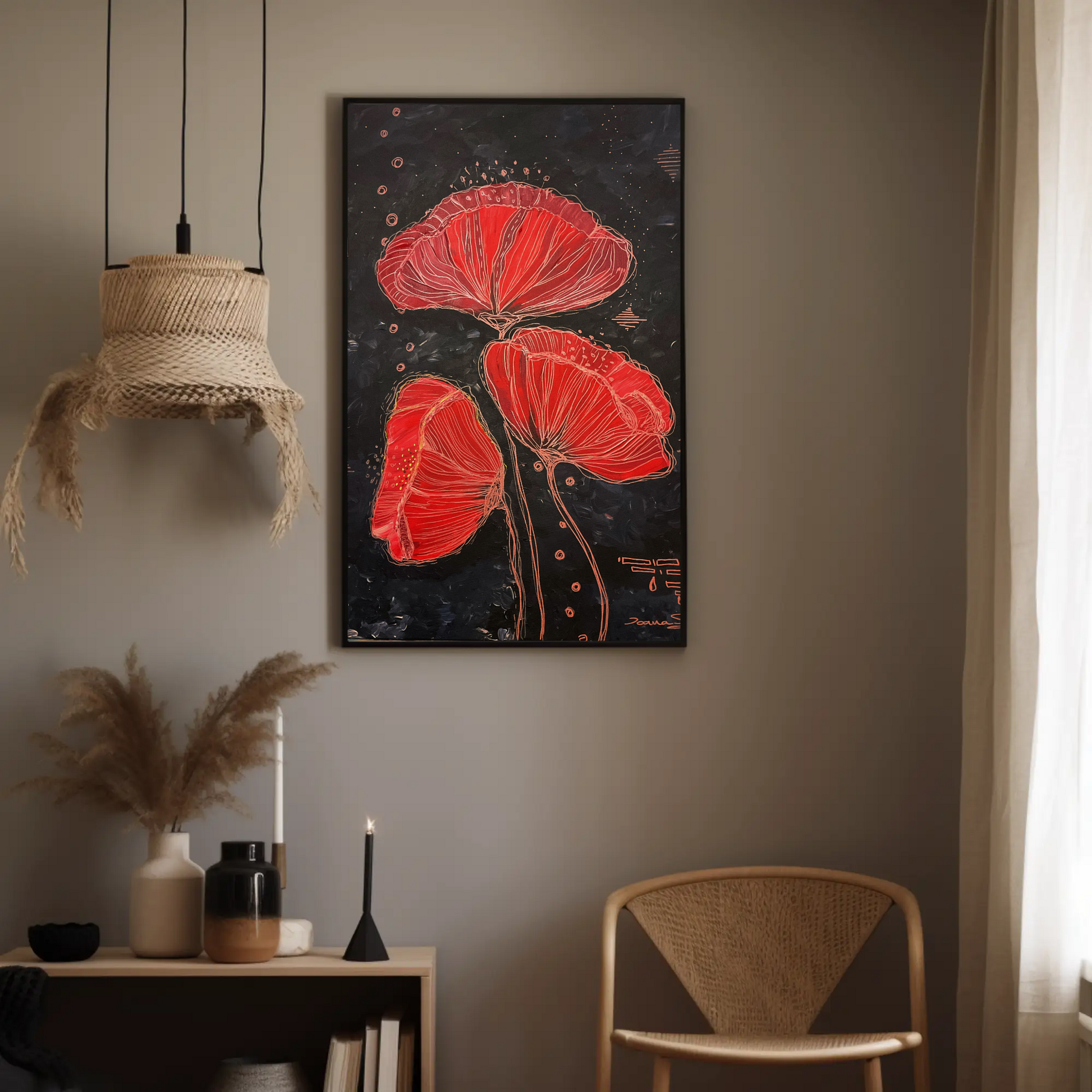 Pe un fond aproape negru, ce a pornit de la un albastru indigo, apoi s-a transformat în gri ce mai răzbate pe alocuri, am pictat trei maci de un roșu atât de viu încât par că sunt de foc. Am lăsat apoi liniile de culoarea cuprului să îi definească, să se joace liber pe pânză.